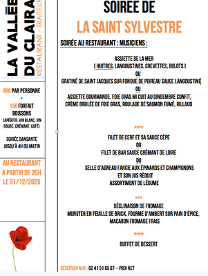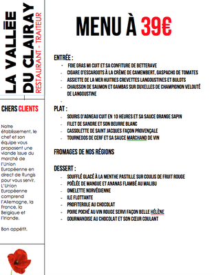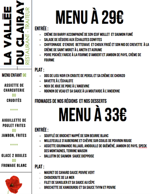 La Vallée de Clairay vous propose tout les midi en semaine une formule complète à prix serrés mais aussi sa carte et les plats les plus fins et raffinés en fin de semaine
